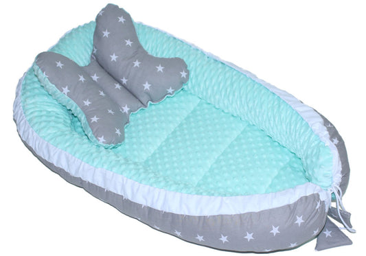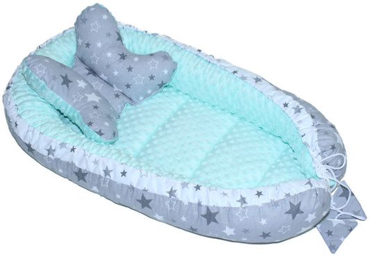 Kokon Baby Minky Nestchen - Sternchen auf Grau+Minze - 2-seitig Kuschelnest Reisebett