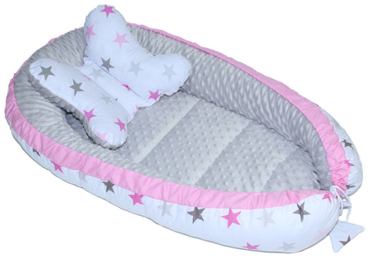 Kokon Baby Minky Nestchen - Star Rosa+Grau - 2-seitig Kuschelnest Reisebett