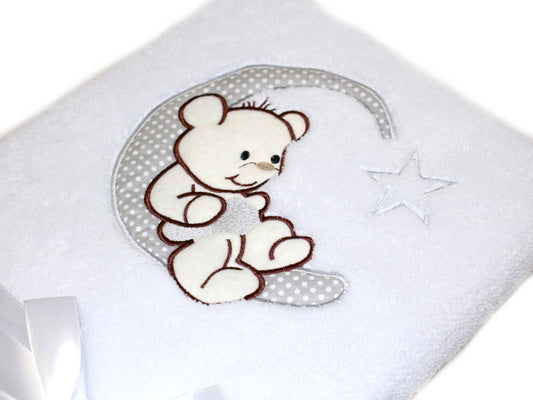 Babydecke mit Namen bestickt -Bär auf dem Mond- Weiß- Kuscheldecke