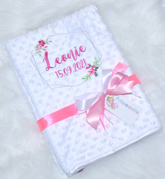 Babydecke mit Namen bestickt -Rahmen Blumen- Weiß- Kuscheldecke