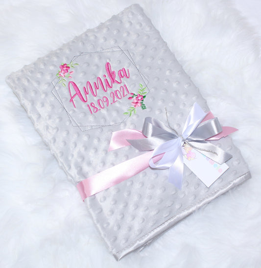 Babydecke mit Namen bestickt -Rahmen Blumen- Grau- Kuscheldecke