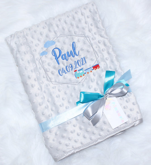 Babydecke mit Namen bestickt -Rahmen Zug- Blau- Kuscheldecke